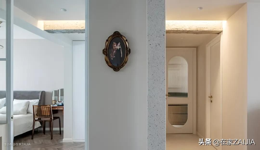 主卧入口调整到客厅方向,右侧通往卫浴间和次卧。设计师保留了顶面贯穿两间卧室的承重梁,并将梁体毛坯化处理,搭配隐形灯带装饰,有种新旧传承之美。