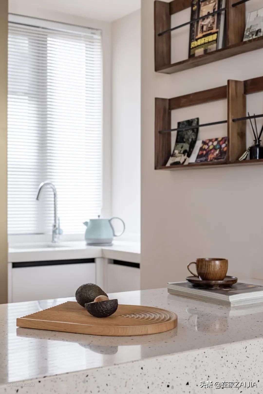 屋主夫妇平时很少下厨,所以不用过多考虑油烟问题,吧台内部和墙面分别设置了书籍收纳区,可满足休闲、咖啡和简单早餐的功能。