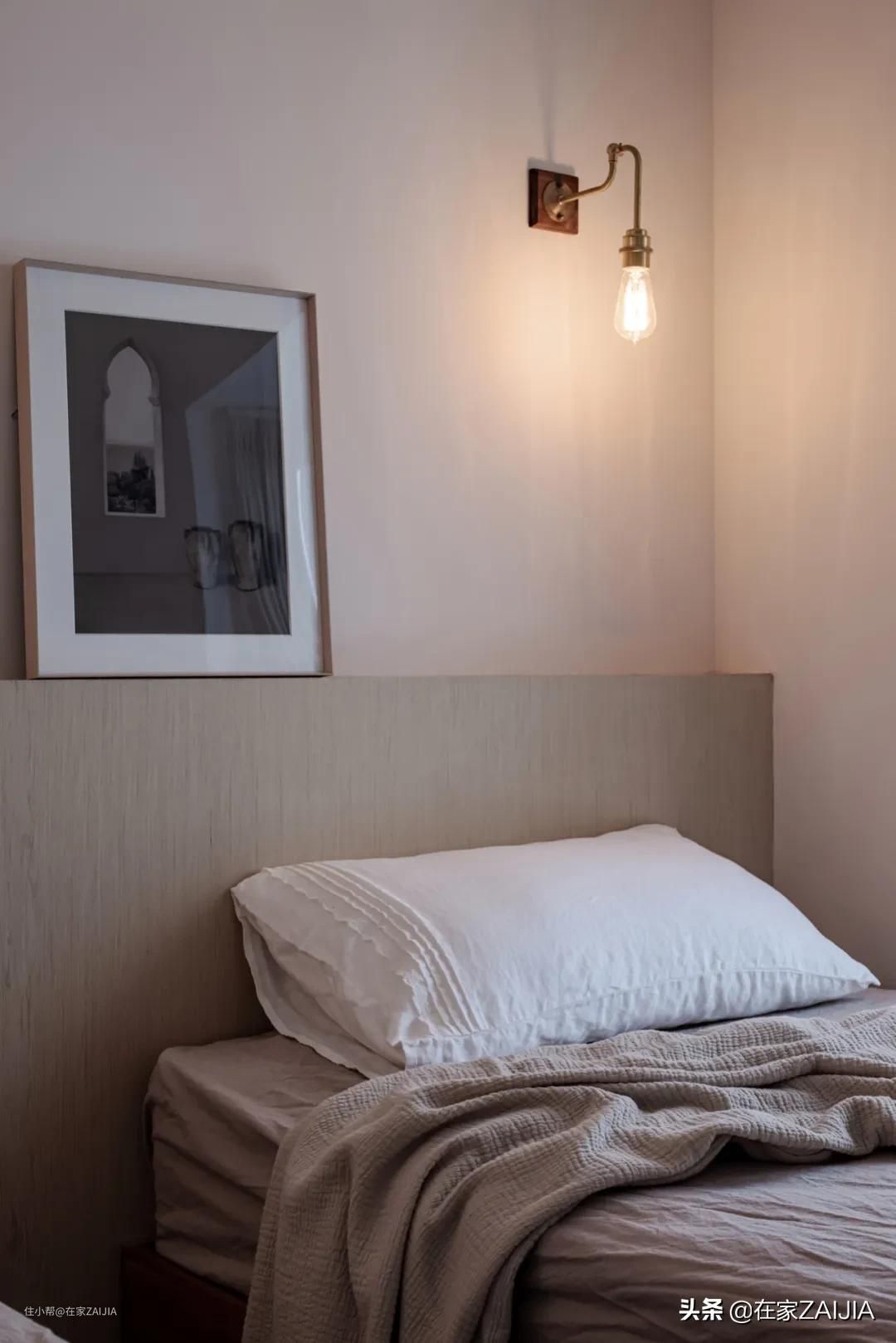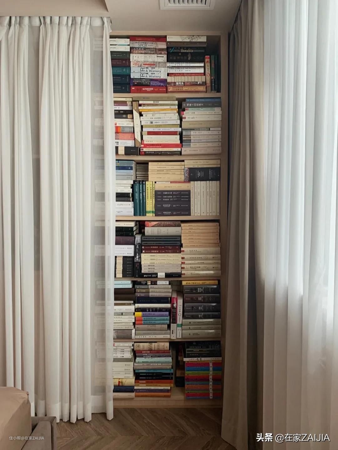 床尾利用墙体结构做内嵌式书架墙,平时软帘拉起、书柜隐藏,不用费心整理。