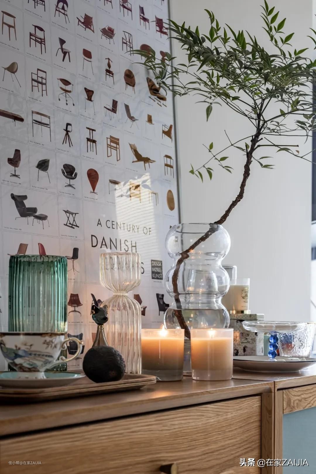 水吧台常用的杯具器皿大都都在旁边的木质边柜内,台面搭配香薰、绿植等,还能装饰空间。