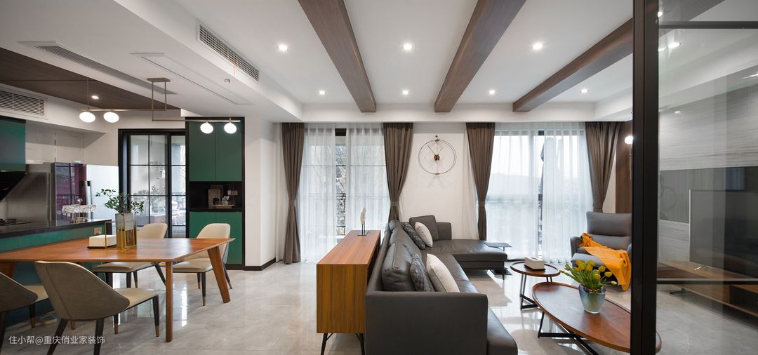 本案例中,设计师将整个公区拆开,不仅用一间卧室打造成超大横厅设计,更是将厨房餐厅打开,让公区面积瞬间翻倍,形成超70㎡的超豪华公区,让一家三代人都能够在这里自由活动,满满的大宅既视感。加入原木元素,让现代风格少了一丝冷冽感,温润而柔和,非常适合有老人小孩的家庭居住。