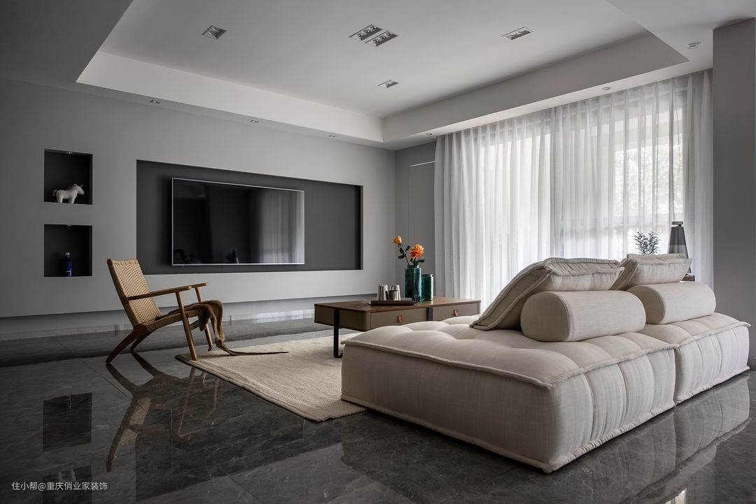 业主一家对电视的需求十分薄弱,所以在整个客厅设计中,电视并不作为设计的中心,因为原户型的比较鸡肋,客厅空间非常狭隘,设计师将餐厅、厨房、客厅全部打通形成一个开放的空间,零碎空间重组后不仅开阔了视野,也让空间变得更加好用,色彩上以橘色点缀灰色糅合空间的冷冽感,提高居住舒适度。