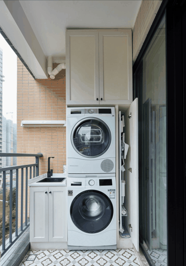 讲究实用的还能把阳台改造成家政区,把洗衣机、烘干机、拖把、吸尘器等全挪到这里。