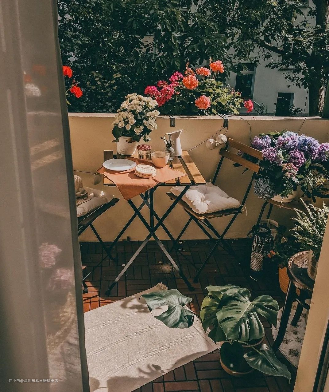 不想封闭阳台?没问题!在阳台种上绿植,摆上室外桌椅,你就拥有了一间“露天咖啡馆”。