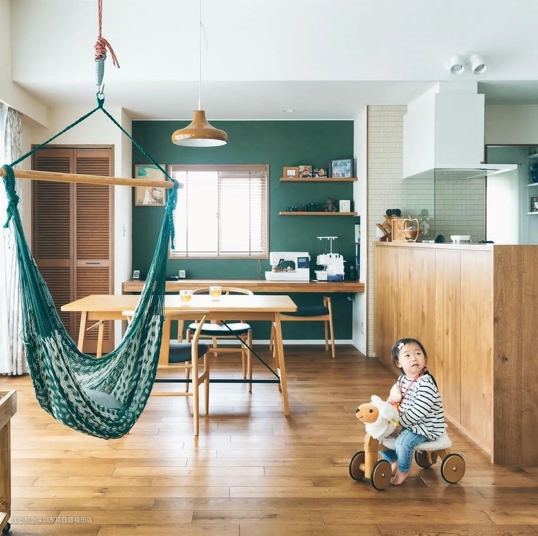 有娃家庭可以在客厅装上秋千、吊床等,打造一个能让孩子们尽情玩耍的“游乐园”。