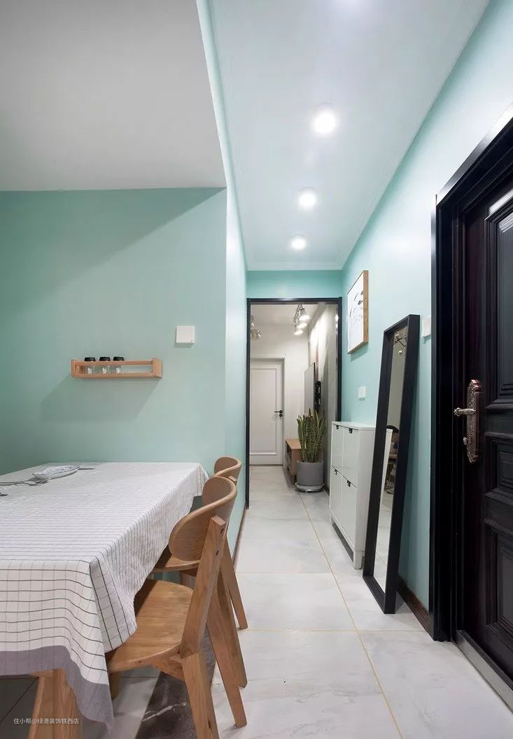 左右两侧分别连接了两间卧室和厨房,墙面刷成了薄荷绿色,虽然采光不好,但也足够明亮。