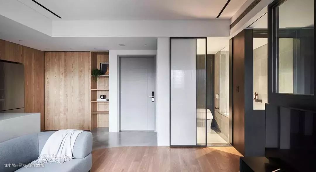 ▲玄关旁边的木质收纳柜,还把冰箱嵌入其中,木质感的玄关,搭配上灰色调的地面,让厨房区域也显得简洁清新好自然。