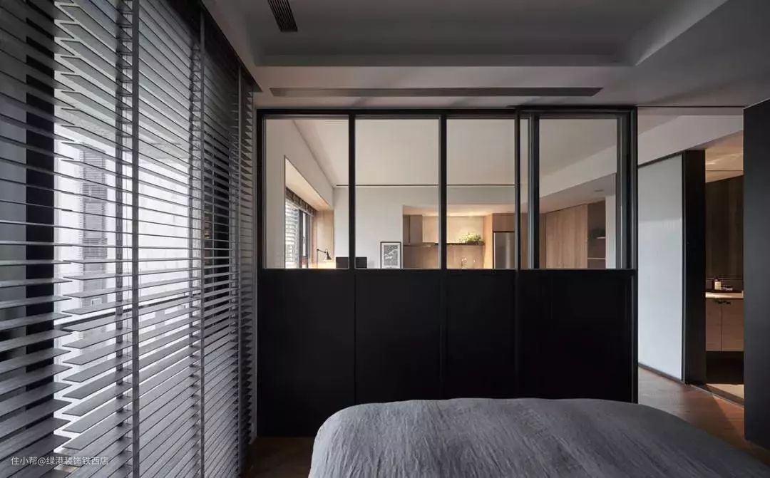 ▲卧室有着较大面积的落地窗采光,因此黑木色的隔断与门框,也并不会显得压抑。