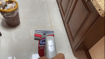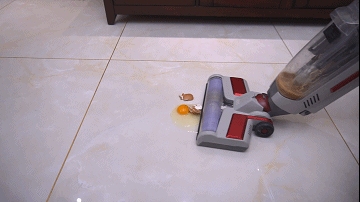 为了给大家测评只能牺牲你了,,鸡蛋液是比较粘稠的不好打扫,有两点是我担心的,蛋液非常粘第一滚刷粘蛋液清洗不掉,第二点我怕清洗不干净的话容易粘灰。在LED屏上选择强力模式,没想到蛋液非常容易的就被吸入了污水桶里,反复拖了两遍我用手感受下地面污渍全被清理干净了,很光滑,看来吸蛋液是没问题的。