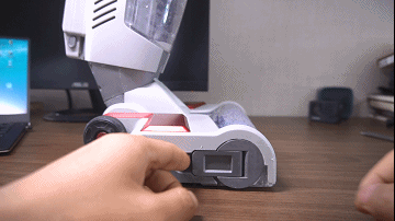 看下两个水箱,上面的那个是680ml的净水箱,下面的是450ml污水箱。在打扫的时候水从上面流入滚刷清扫,清扫之后的污水被收到污水箱里面。手把上有个开关一按水就能喷出来。