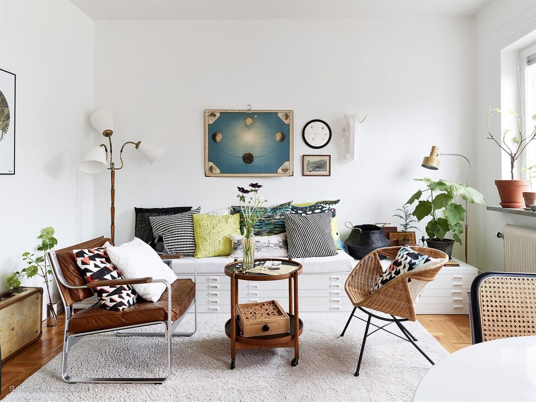 如若你家客厅空间有限,不妨参考这种布局。利用底部可以收纳的卡座形式,搭配两个单人椅,效果非常赞。