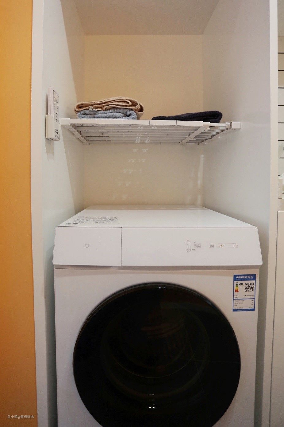 △洗衣池+抽拉式冷热龙头,除了手洗衣物,还可以在这简单洗个头本来的计划是烘干机+洗衣机,最后买了洗烘一体的,上方空出的位置临时使用伸缩搁板放置毛巾。