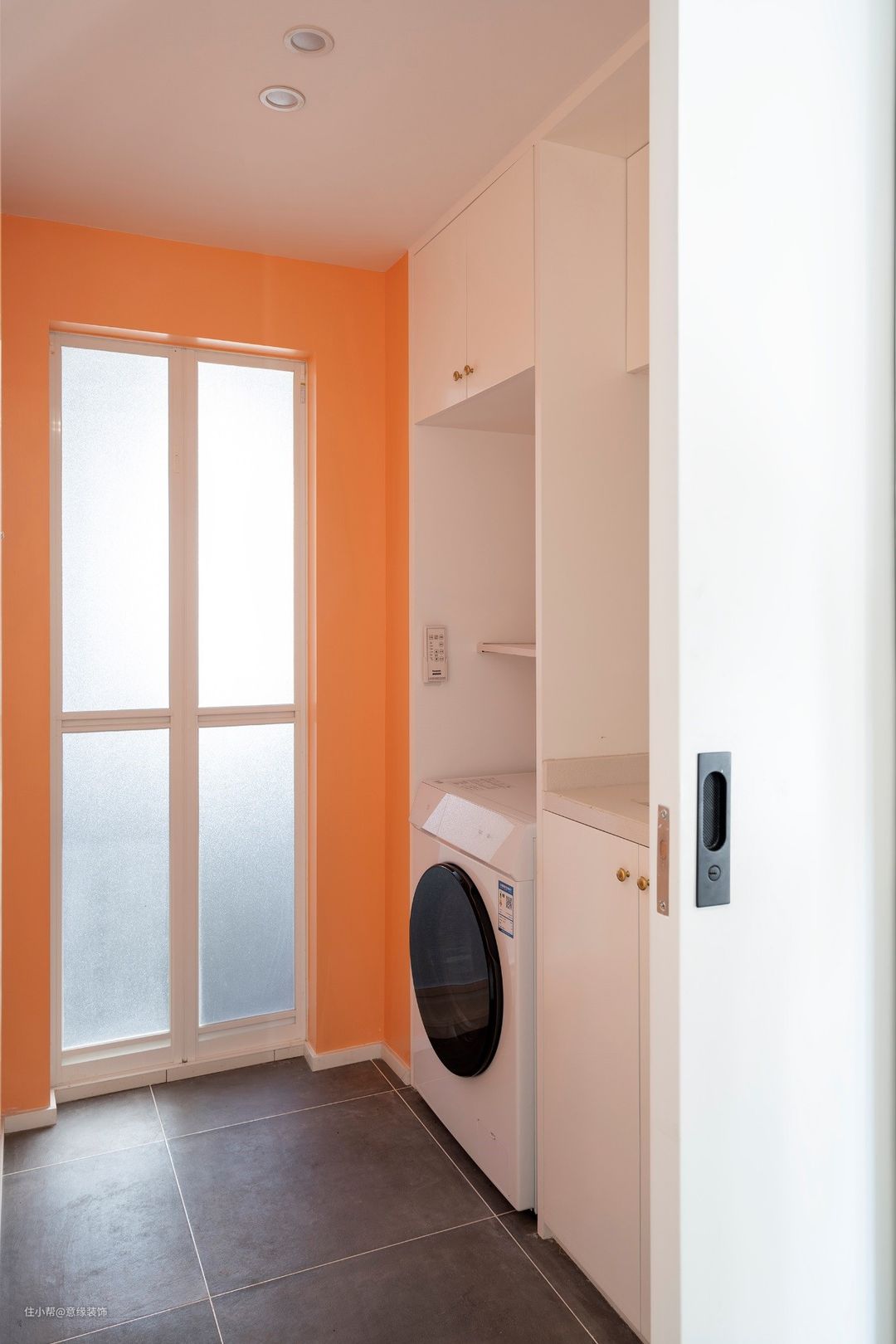 △洗衣间,用一扇隐藏门与客厅隔开,关上门,更衣后进入淋浴间