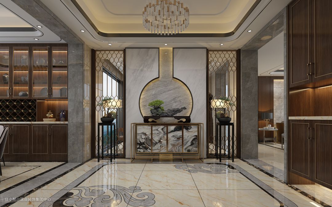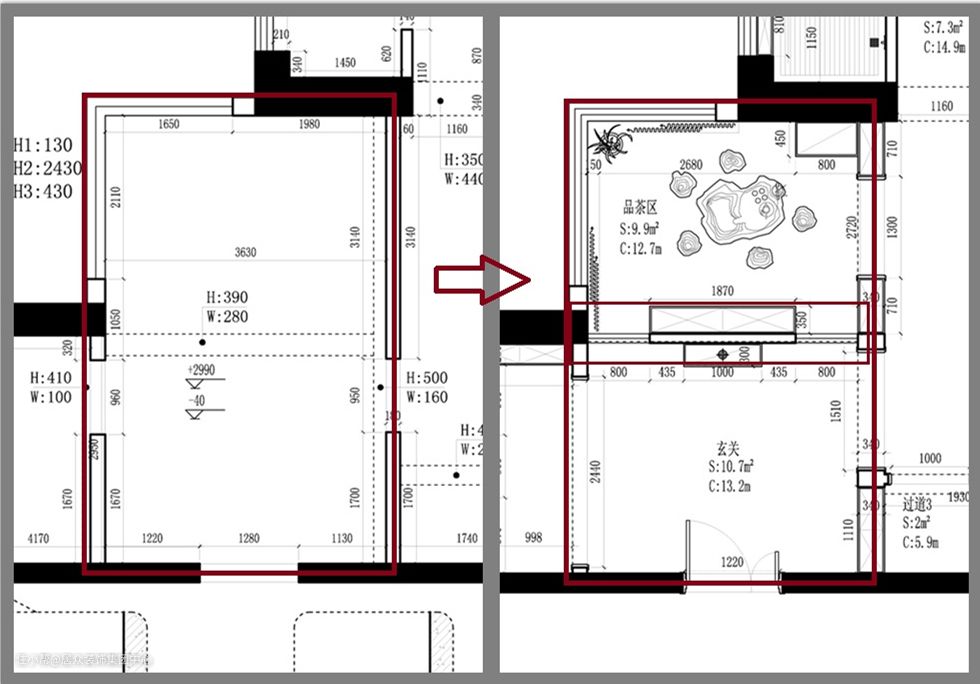 如上图所示,在玄关处增加一个镂空的屏风隔断,把空间一分为二,既改善了入户的空间格局,又呈现一个苏州园林式的优美造景,同时还拥有一个茶室,美观大气,可谓一举三得。