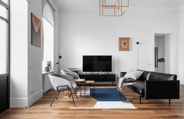 黑色皮革沙发搭配浅灰布艺沙发,围合成灵活会客区,更利于交流互动。