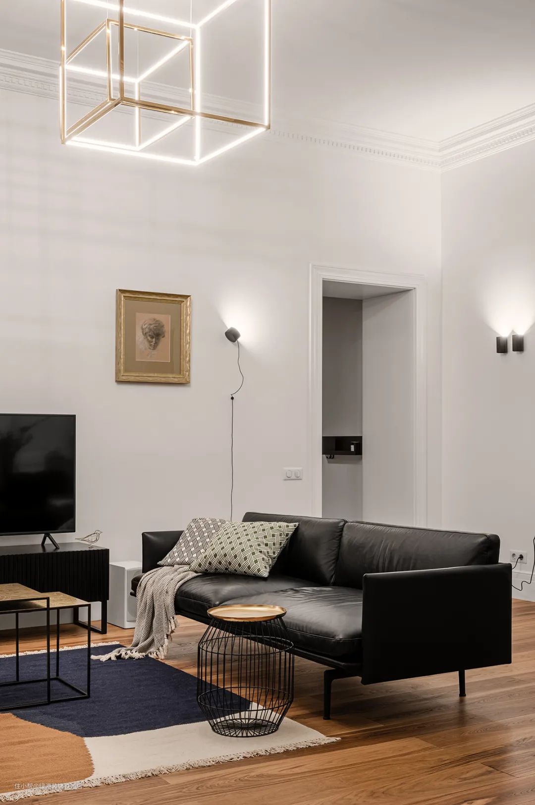 墙上的装饰画和一盏悬垂吊灯引入黄铜金属元素,增加精致高级感。