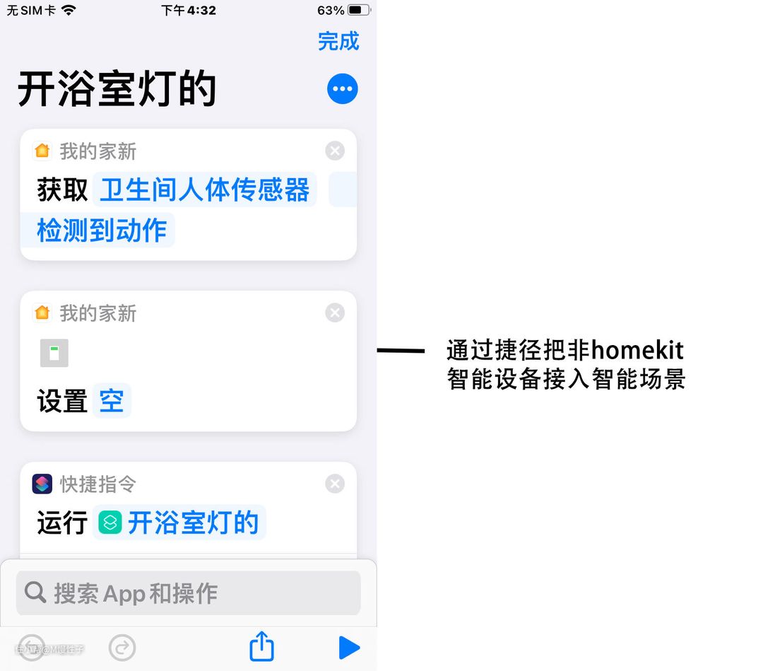 ▼例如,目前我浴室的灯是米家的浴霸,目前是不能接入到homekit中,目前可以通过捷径,在家庭app自动后+一条打开米家app浴霸灯的自动化指令,做到曲线接入。