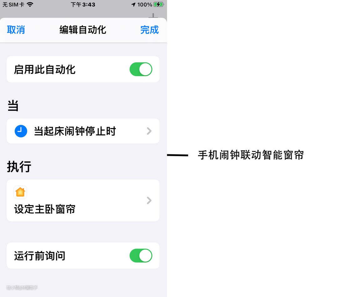 ▼当闹钟结束停止时,窗帘打开一条缝,提示我们要起床了等等,这种与手机深度结合的智能化场景。