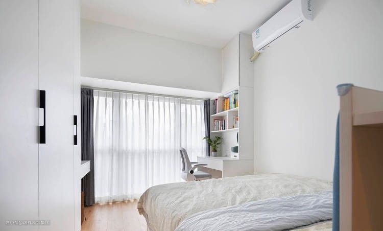 由于客餐厅没有窗户,所以我们将老人房的门换成一大扇落地推拉门,把户外的阳光引进来,整个空间用了大量的白色高柜,加上大面积的白墙,增强了视觉上的明亮感。全屋除湿区外都是木地板的设计,对家里小朋友和狗狗都很友好。蓝色系的配色让人放松。