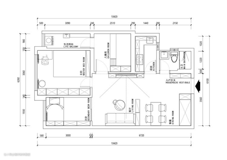 我们做了以下优化: 1、入户门右侧设计了定制一体换鞋凳,左侧是集合冰箱、鞋柜、餐边柜、收纳柜一体的组合柜,把冰箱从厨房挪到了客厅,扩大了厨房的使用面积。 2、将厨房的门缩短一些,从而获得更大的电视柜。 3、卫生间在干湿分离基础上,拥有更多的收纳空间。 4、将主卧门位置进行了调整,让1.8m的床,超大衣柜、书桌和梳妆台都有自己合适的位置。 5、次卧也做了一整面的柜子,拥有超大的储物空间。