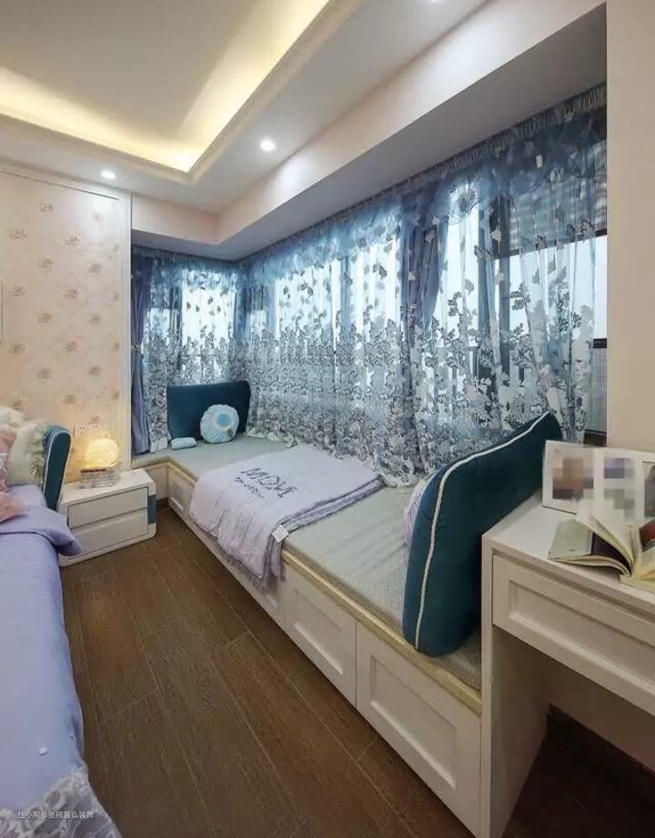 雾霾蓝窗帘加浅灰色飘窗垫,看起来有种海风拂过的感觉。大量的纱织装饰,提升温柔的感觉。但是这种风格可能不耐看,时间久了会觉得有点俗气。