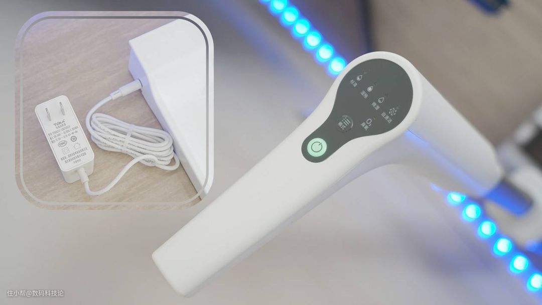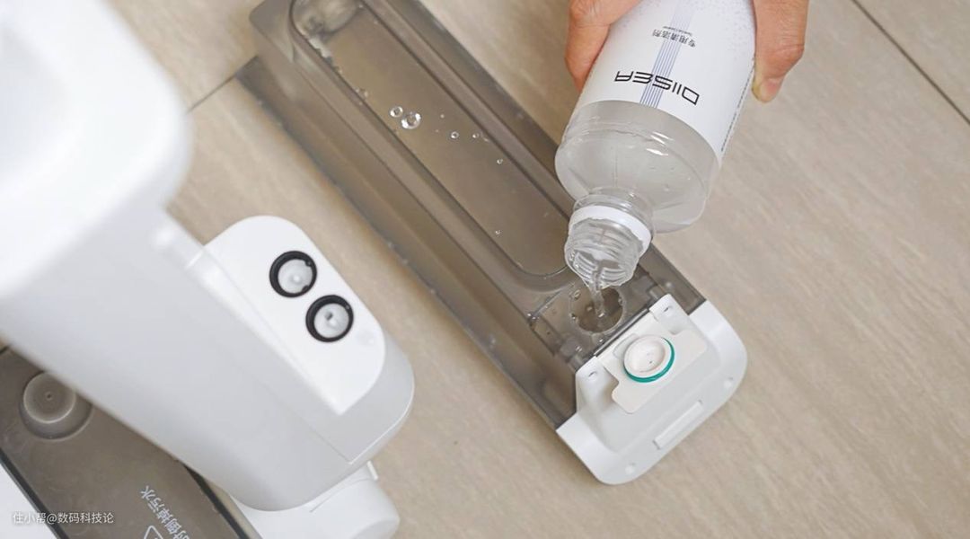 从手感上来说,净水箱和主机的重心比较低,DIISEA滴水洗地机二代TI8P本身又是轻量化设计,在使用中手腕受力很小,操控还比较舒适。而且在使用中净水箱有紫色LED氛围灯,不仅能起到装饰作用,而且还让水位看得更清晰。