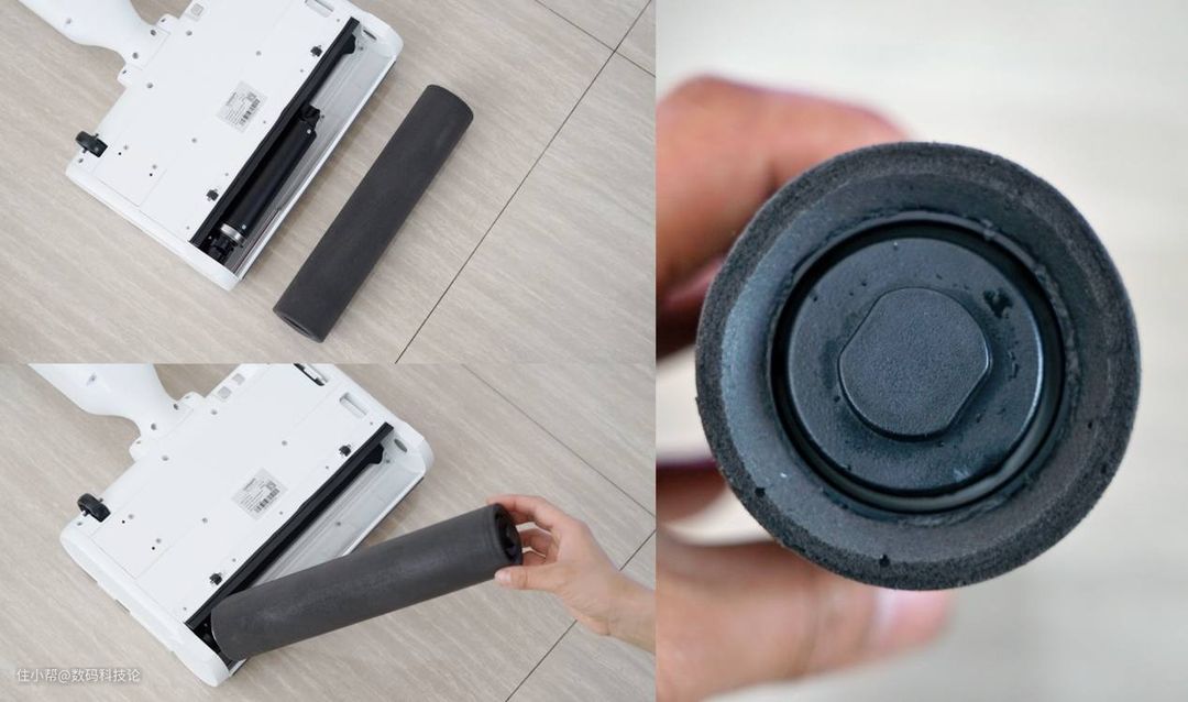 至于滚筒的安装直接对准电机装入,按压按钮卡到预设位即可。我比较关心的是这个滚筒本身的设计,因为这个既要储水性好又要耐磨有弹性,从实际上手来看,其采用了内外双层的不同材质,表现也比较满意。