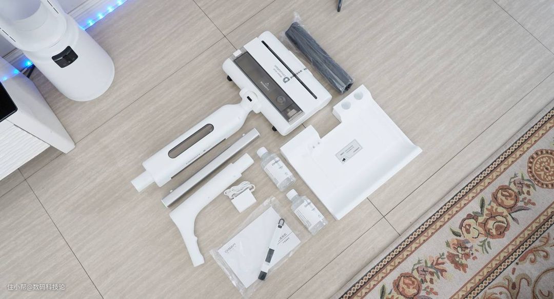 产品包装没什么好介绍的,里面的配件也比较规整。包括:主机、滚筒、铝合金延长杆、手柄,充电底座、充电器,以及两瓶专用清洁剂和二合一清洁毛刷。产品主色调为白色,第一眼给人的感觉很清雅。