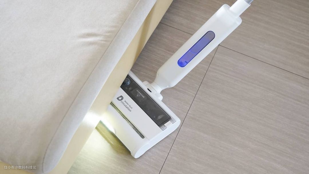 滚筒前端有LED照明,清理光线相对较暗的沙发底、茶几电视柜的犄角旮旯也不用单独打手电筒照明。DIISEA滴水洗地机拖头部分是8cm的高度,手柄支持上下90度,左右180度旋转,也适用于床底,沙发底,柜子下面等死角的深度清理,非常灵活。要知道,普通洗地机的机身肥大,一般也就只支持60度左右旋转角度,很多容易藏灰的角落根本没法清理到。