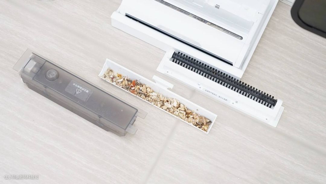 所有的垃圾都会自动干湿分离,分别收集。电动毛刷在这个过程中也是作用发挥很明显,可以保证滚筒上不会留下果壳果皮。从容量来说,千万别小瞧这个窄窄的干垃圾收集仓,存放200g的瓜子皮没问题,房屋正常保洁的话,基本也是清理140平米不需要倾倒垃圾。当然如果是遍地过嗑瓜子皮之类的,建议看是用扫帚先预处理一下了,这样的话能延长滚筒使用寿命。