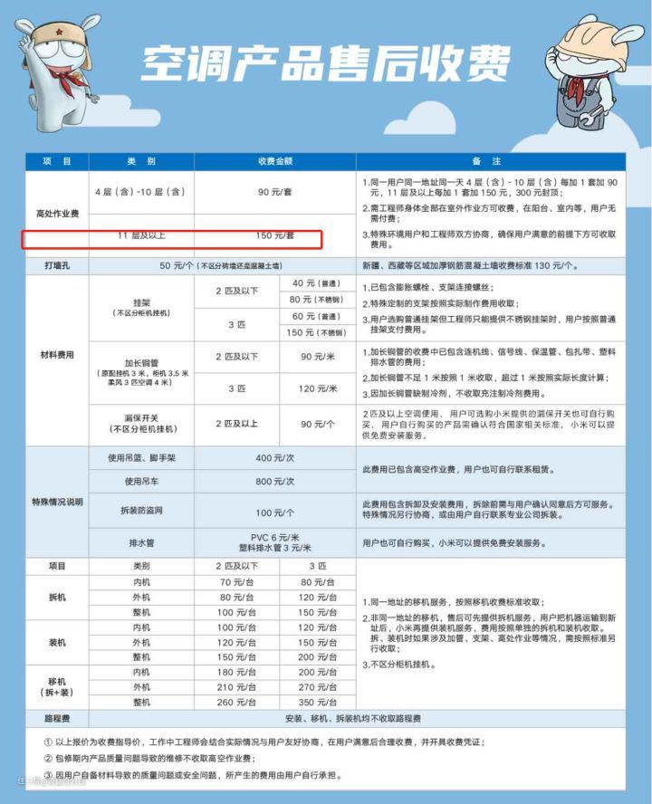 ▲另外,整个安装过程中没有任何乱收费的现象,在小米有品空调商品页面中有所有的安装费用报价,我这次安装打了一个墙孔,花费50元,这种明码实价的收费我交的也开心。