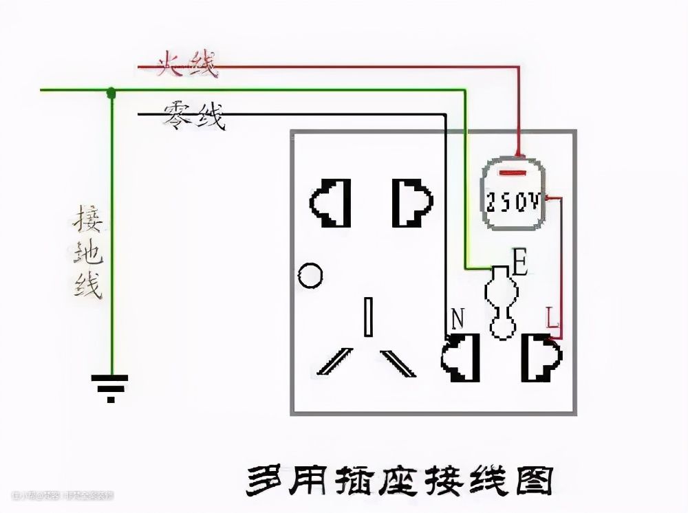 接线时,需记住“左零右火”定律(即指人面对插座时,插座的左侧插孔(接线柱)接零线,右侧的接火线。接线时,人是面对插座背面的, 因此此时应该将右侧接线柱接零线,左侧接火线。),L线接火线,N线柱接零线,地线接线柱接地线。