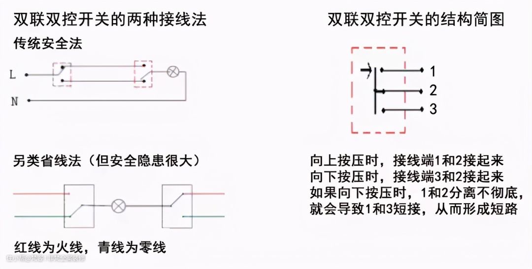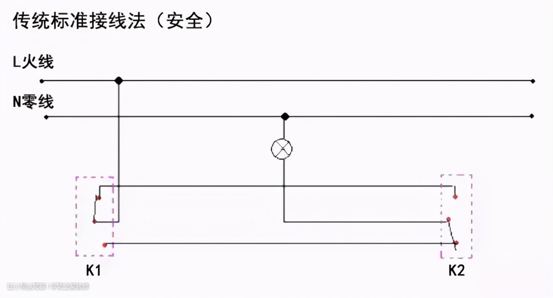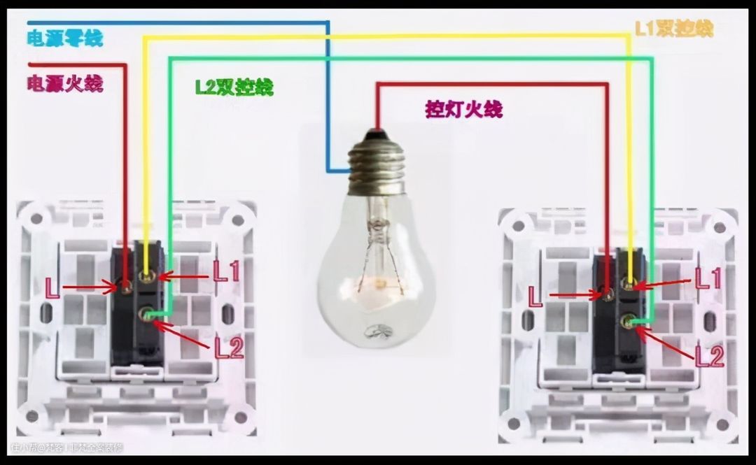 这里要注意无论是单控还是双控开关,它们的L都是接火线。另外,双控开关的L1与L1连接,L2与L2连接。
