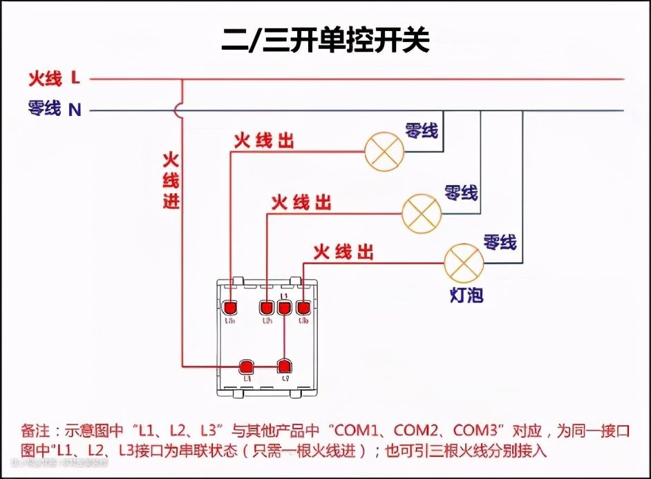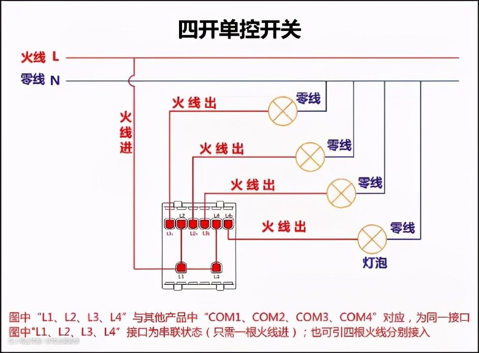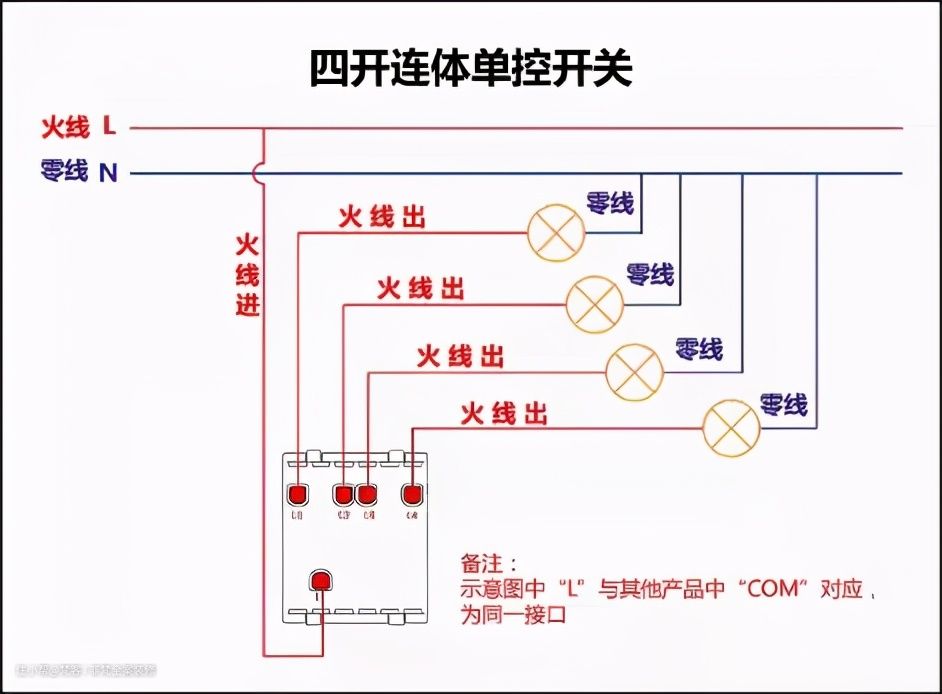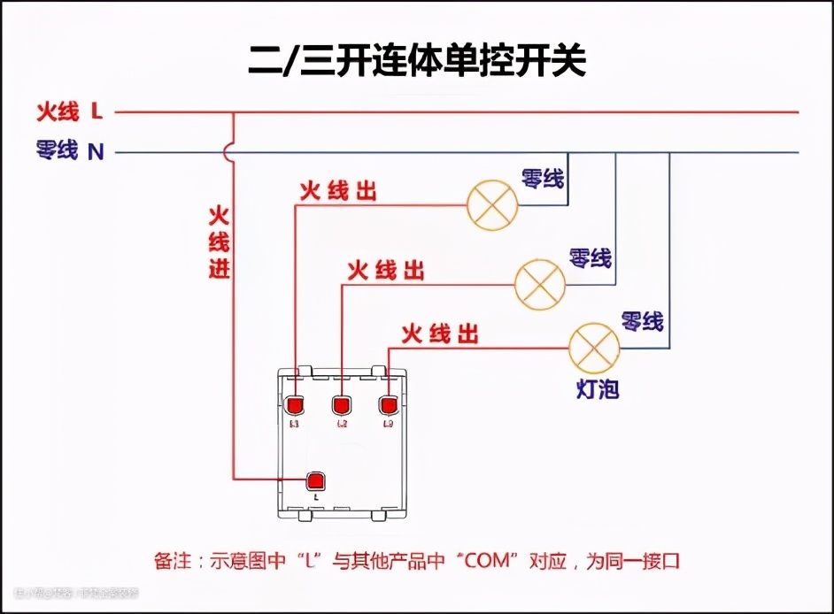 多开单控进线就一个接线柱标识为COM(公共点)。接线时注意COM接火线, L1,L2等,分别接需要控制的灯线。
