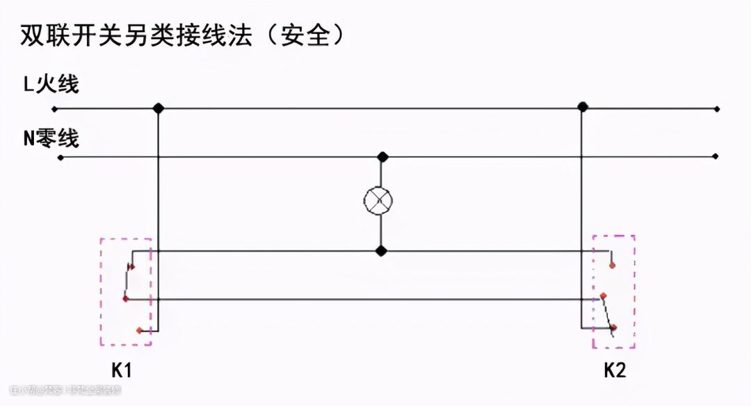2:双联线中的K2连接两个开关的上接线端(或者下接线端),并且在中间接一条分支线与灯的一端连接,灯的另一端接零线。