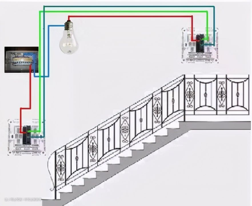 - 双联专用线中的一条导线,中间引出分支线接于灯的一端。(传统双联双控电路是不允许在双联专用线中引出分支线的)