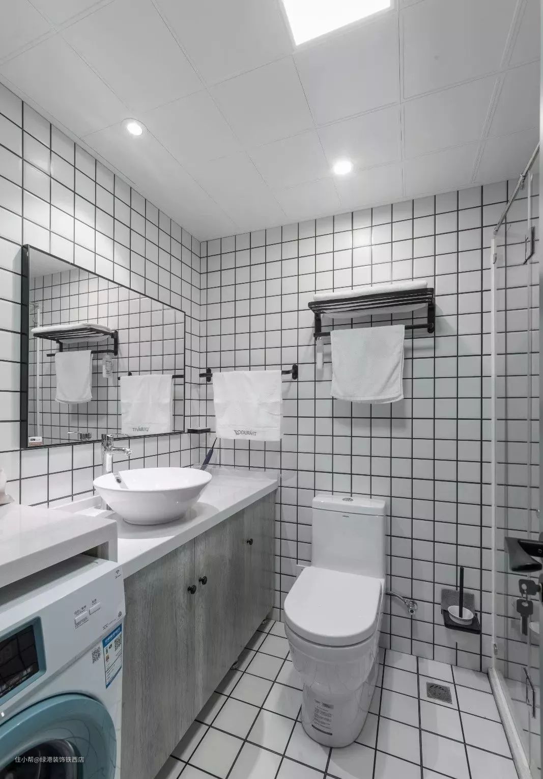 卫生间面积虽小,但也做了干湿分离;洗漱区还容下了洗衣机,空间利用得非常充分,而且不显拥挤。