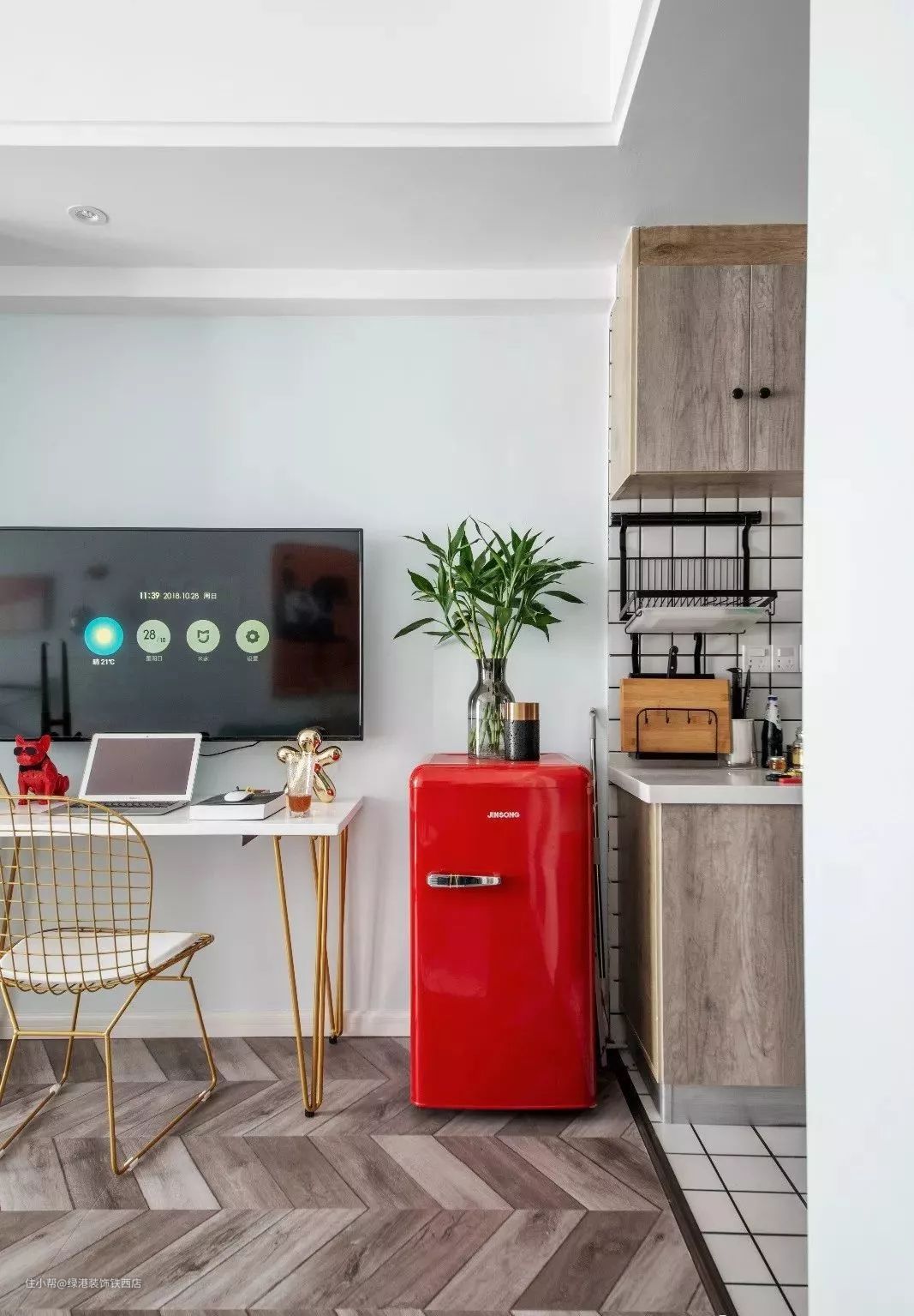 一旁的红色冰箱非常显眼,即是装饰也可满足一个人的存储需求。