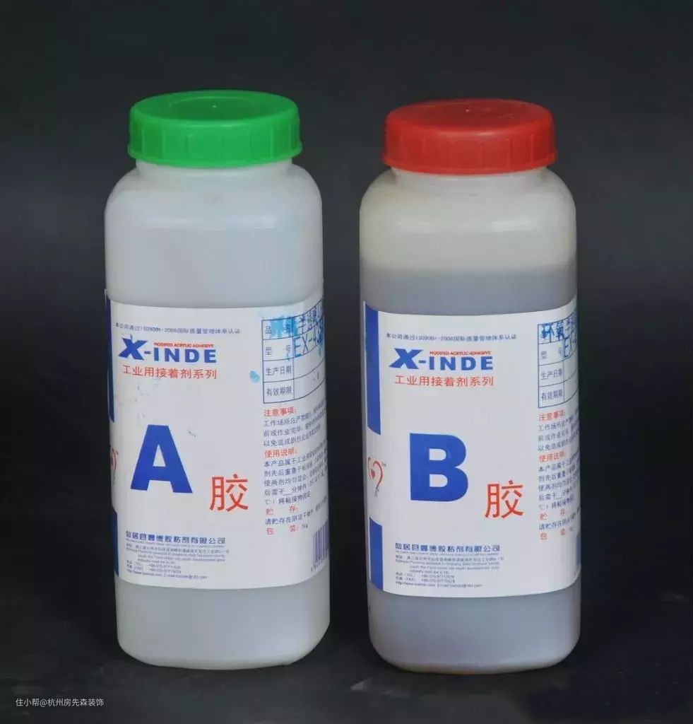 AB胶是“两液体混合硬化胶”的俗称,A组分是丙烯酸改性环氧树脂,B组分是改性胺或其他硬化剂,其实就是固化剂,二者在混合反应硬化过程中会挥发出有毒性有机物,气味很大,在室内装修环境里尽量减少使用或者干脆不使用。