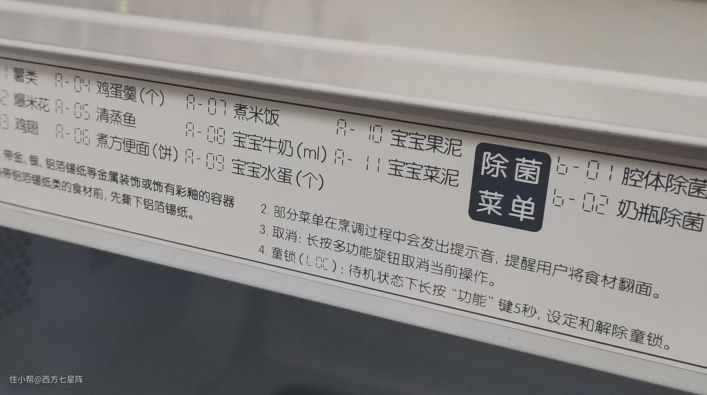 门框上有各种功能和注意事项介绍,这个细节挺好的,毕竟不是所有用户都会第一时间查看说明书后才开始使用,而微波炉如果使用不当会有一定风险,这样可以更有效的提醒用户注意安全。