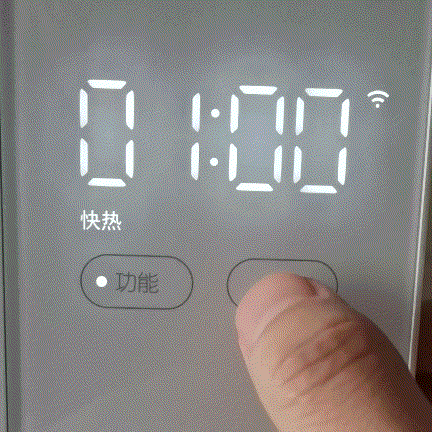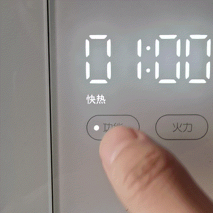 米家微波炉基本操控很简单,按“功能”按钮可切换工作模式,依次是快热、解冻、食谱、除菌及自选四种模式。