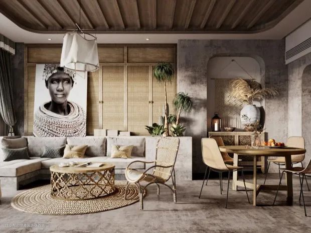 木头、竹子、藤料、毛麻制品等被大量运用。多以绿色植物,本色木头等材料来表现。