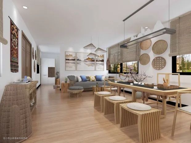 新中式风格是比较自由的,装饰品可以是绿色植物、布艺、装饰画,以及不同样式的灯具等。