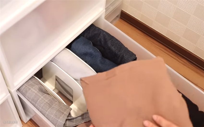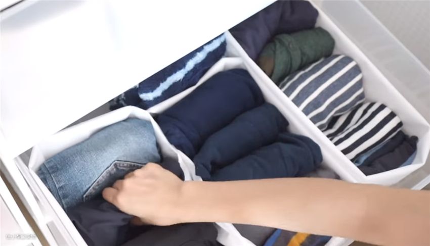 其实很简单,只需要在抽屉里放入这种软布筐,来分隔抽屉内的空间,再把叠好的衣服竖着放进其中,就能起到合理收纳的效果了,而且这样做,查找和拿取衣物也更加方便。