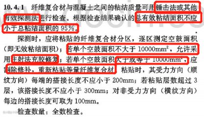 纤维复合材与混凝土之间的粘结质量可用锤击法或其他有效探测法进行检查。根据检查结果确认的总有效粘结面积不应小于总粘结面积的95%。