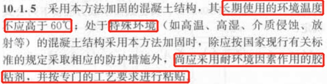 3、《混凝土结构加固设计规范》GB50367-2013 里明确其长期使用温度不应高于60℃。但应指出,这是按照常温条件下,使用普通型胶粘剂的性能确定的。当采用耐高温胶粘剂时可不受此限制,但应受现行国家标准《混凝土设计规范》 GB 50010 对混凝土结构承受生产性高温的限值。