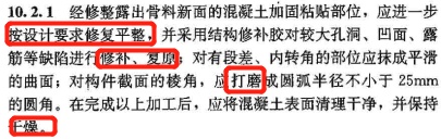 同时我们还需要对基面进行处理,棱角打磨(圆弧半径不小于25mm),干燥处理等,具体请参考《建筑结构加固工程施工质量验收规范》GB50550-2010。