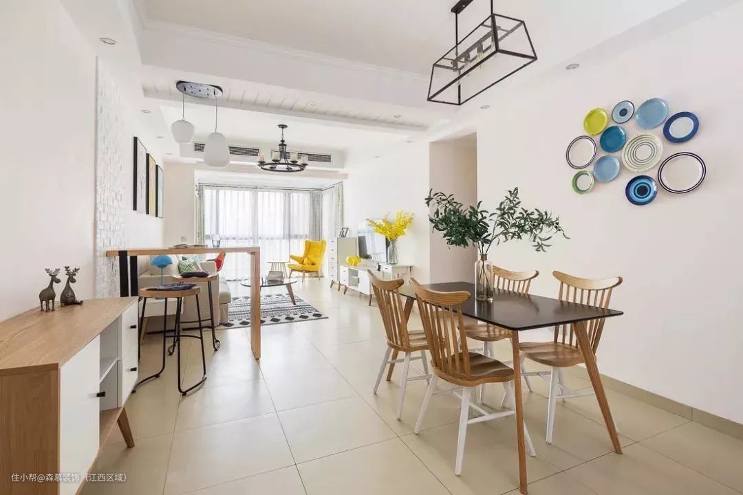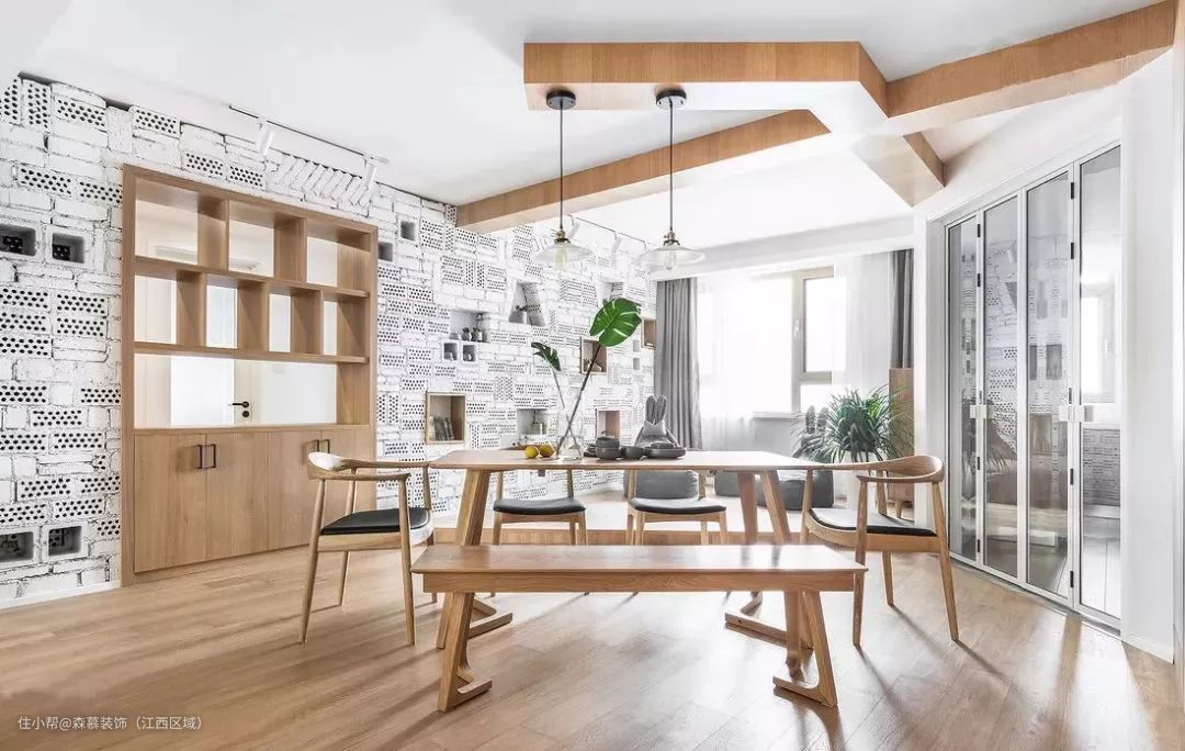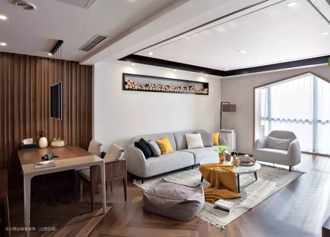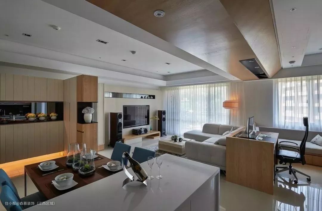 30、客餐厅做个高低错开的吊顶,美化横梁也挺漂亮。