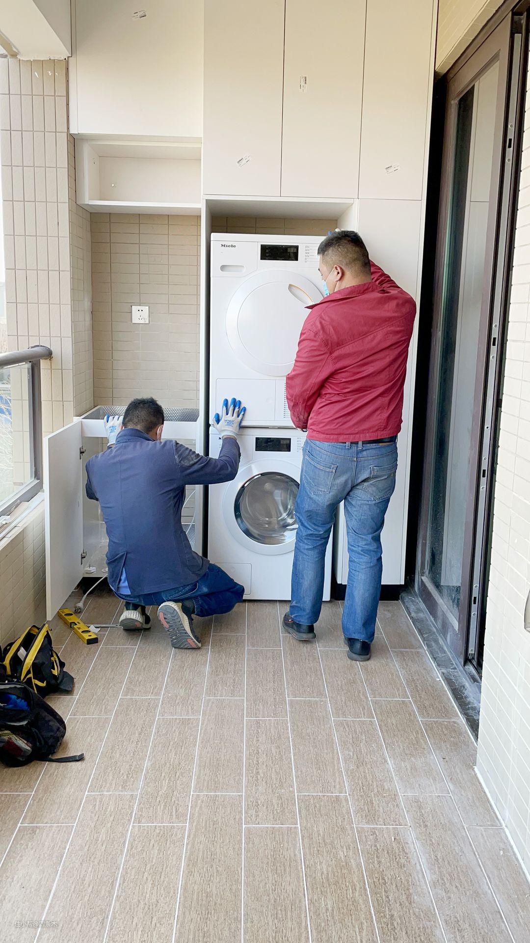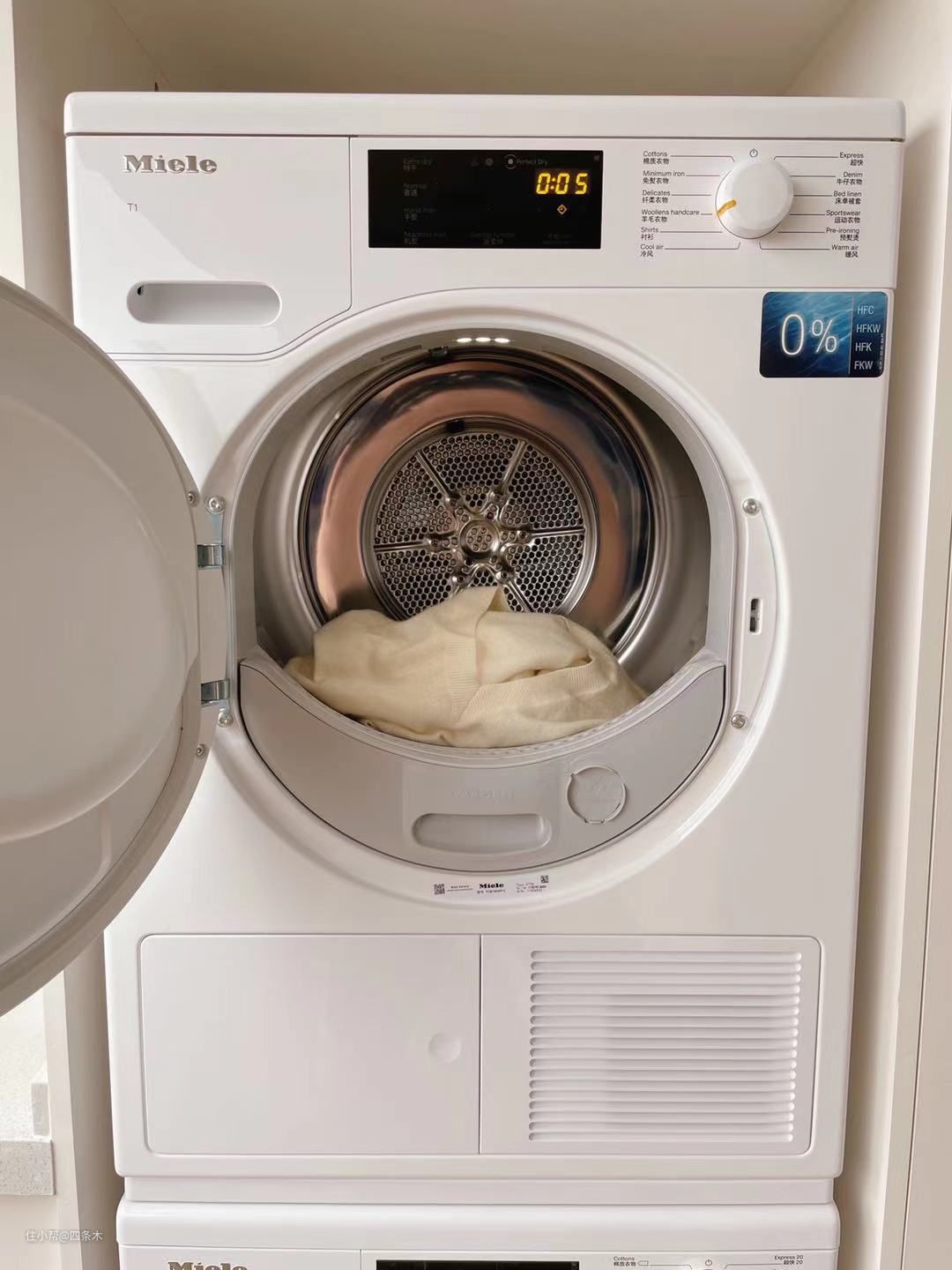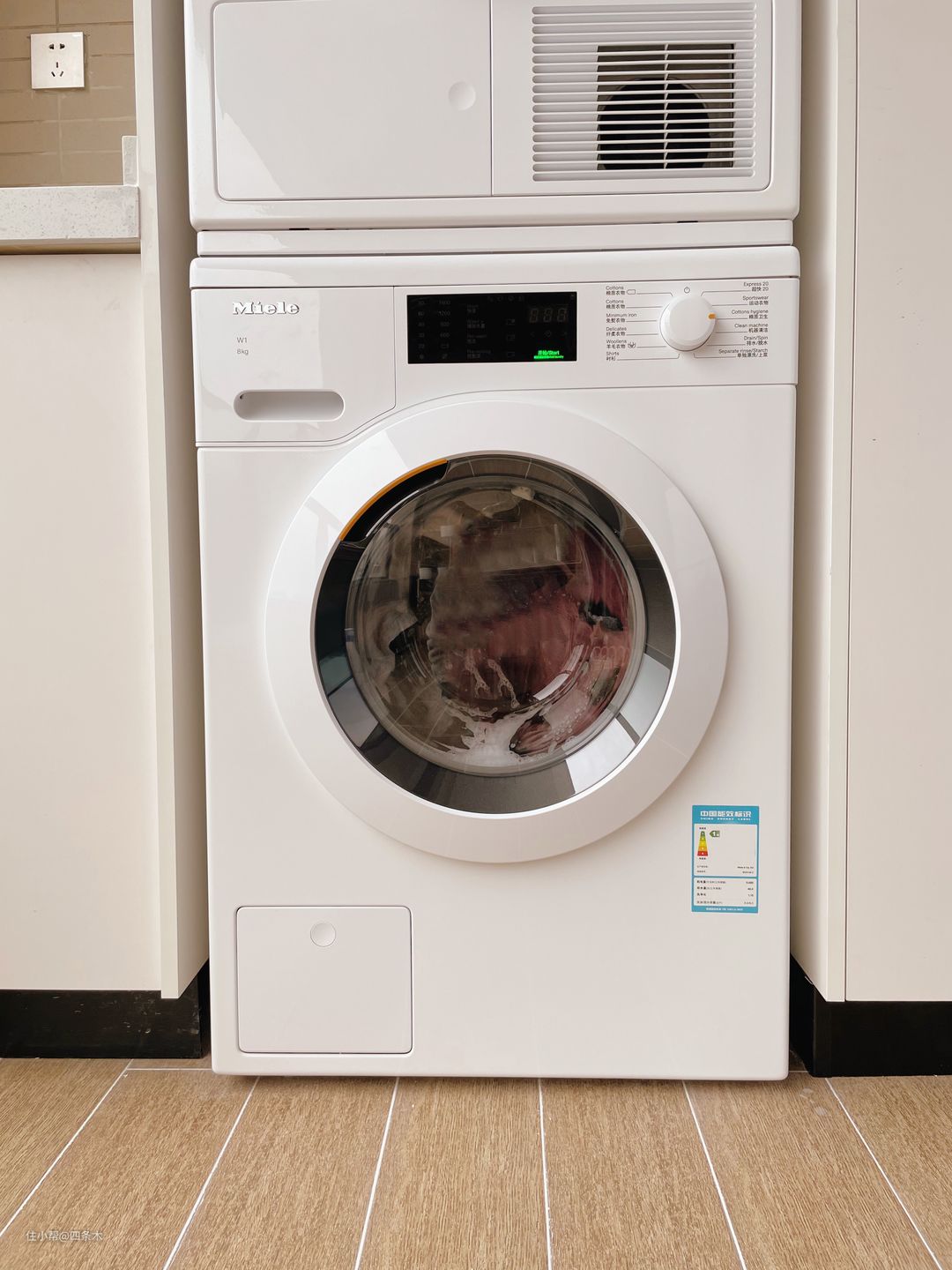 我家是把洗衣机和干衣机叠放起来的,用的是美诺Miele 洗衣机WCD120+热泵烘干机TCB140套装,中间有连接件固定很稳的!两台机器都是白色的外观,颜值简直满分!