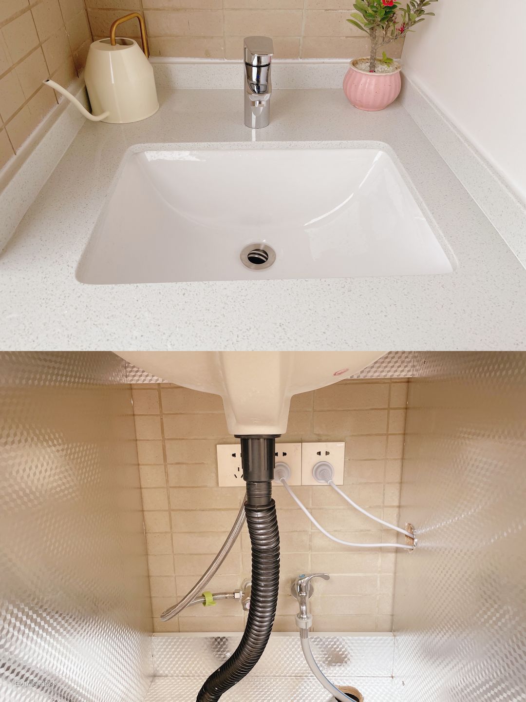 预留一块小空间做一个水槽柜,装了一个内径420*300*180mm的小台盆,用来洗手或装水浇花。